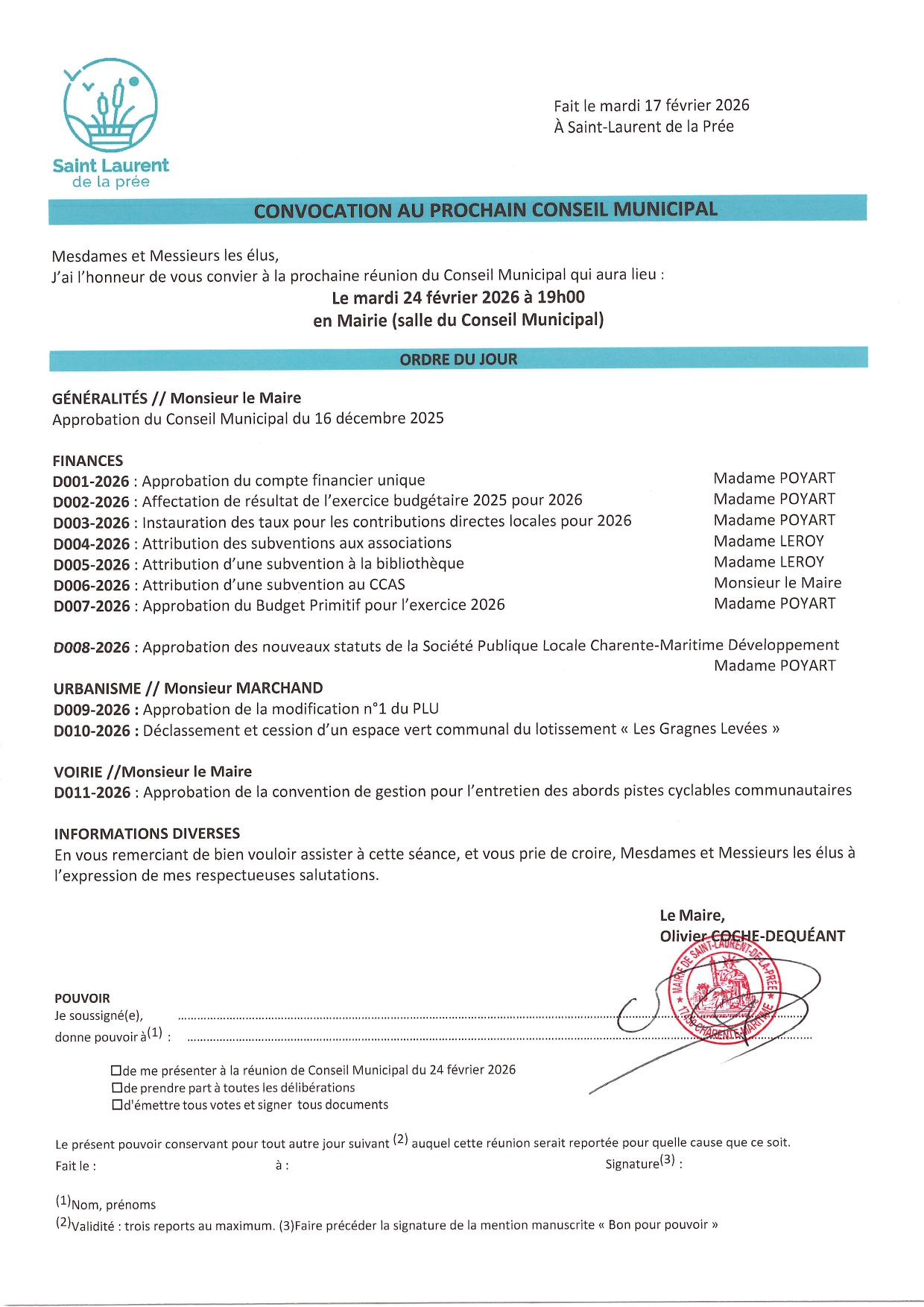 Actualités de Saint Laurent de la Prée Pièce de théâtre « Le procès » – le 01/03/2026 Coupure d’électricité programmée le 19/02/2026 Conseil municipal du 24 février 2026 Coupure d’électricité programmée le 18/03/2026 Modification n°1 du Plan Local d’urbanisme La distribution de composteur continue ! La CARO vous accompagne dans la recherche de médecin traitant Voir toutes les actualités