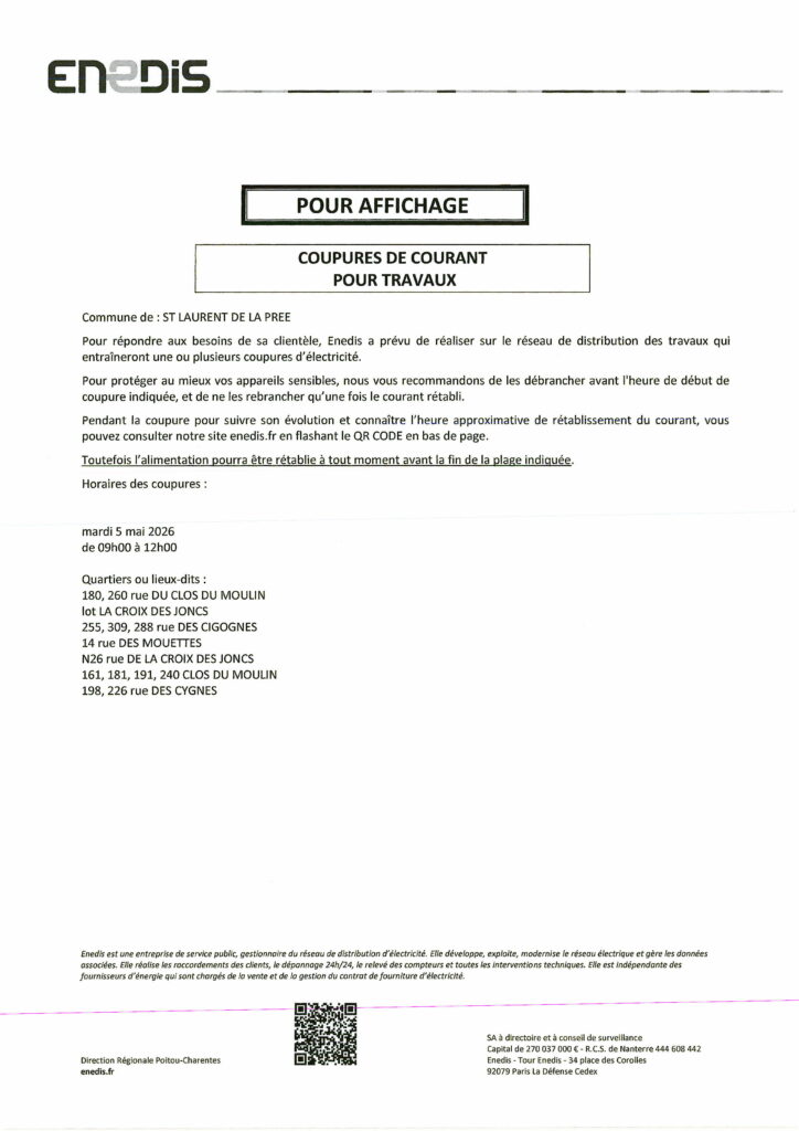 Coupure d’électricité programmée le 05/05/2026